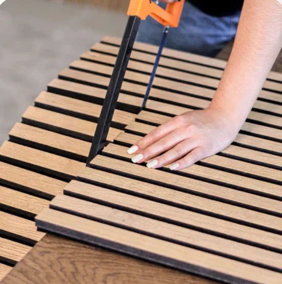 🌿 Materiais: MDF + lâmina de madeira + feltro acústico reciclado